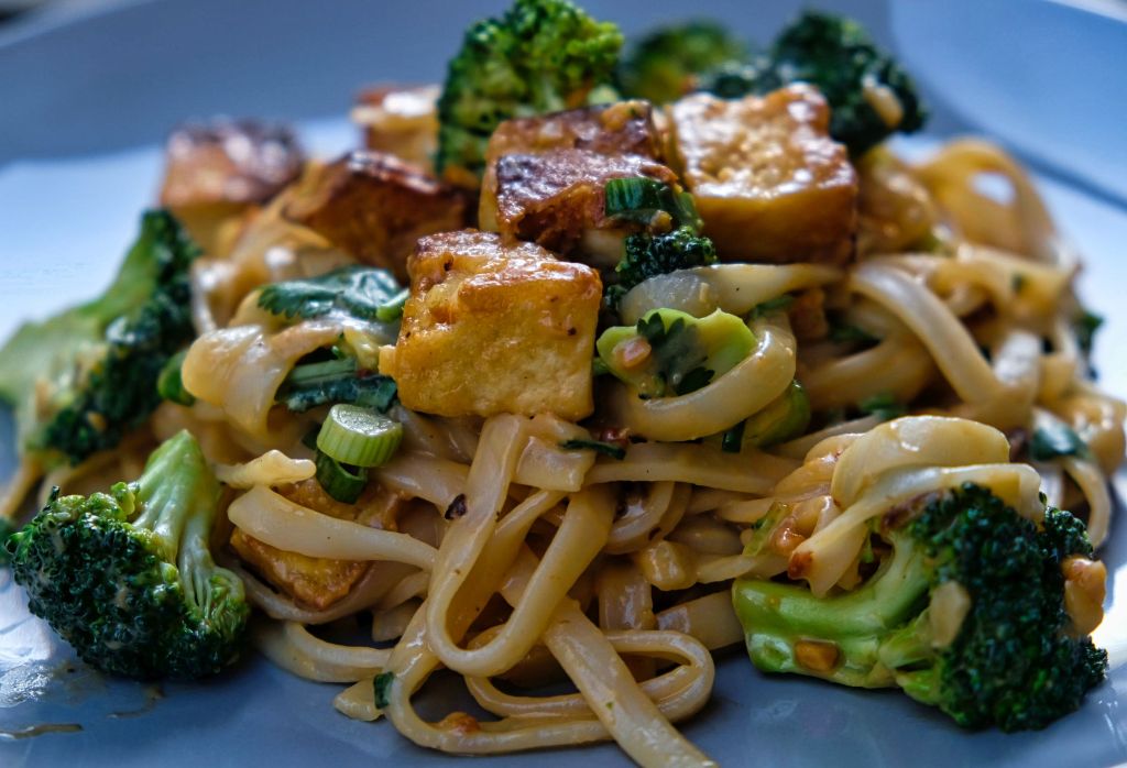 Thai Noodles with Broccoli, Crispy Tofu, and Spicy Peanut Sauce