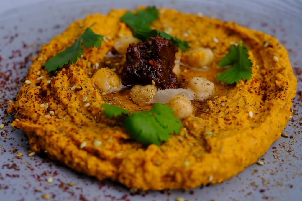 Roast Carrot Hummus with Sun Dried Tomato Harissa